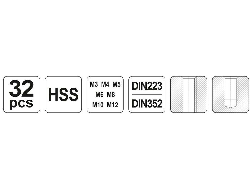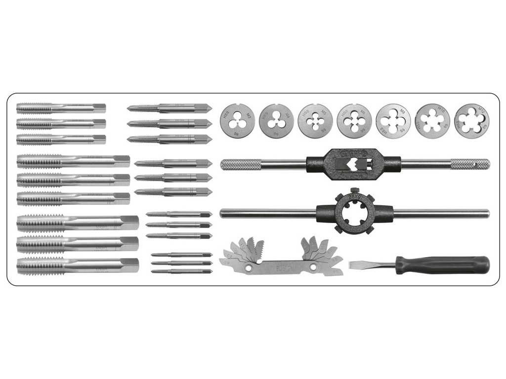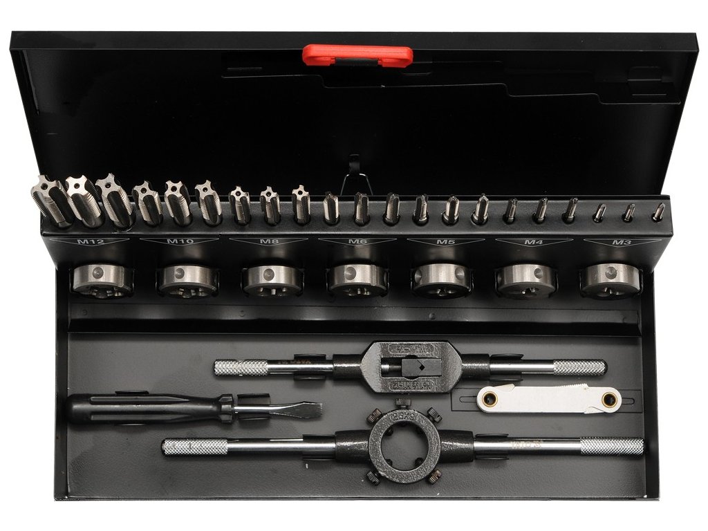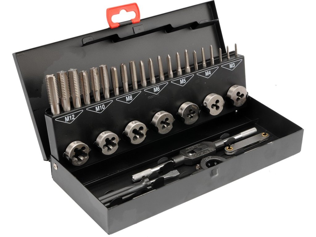 Sada kvalitných závitníkov a očiek vyrobených z rýchloreznej ocele HSS. Rýchlorezná oceľ HSS je už skutočne kvalitný materiál na výrobu závitníkov. Je to vyššia kvalita na rozdiel od nástrojovej ocele (NO). Závitníky a očká z rýchloreznej ocele HSS poslúžia aj pre náročné nasadenie. Túto sadu Yato vyrába pre Poľského distribútora Český tradičný výrobca Bučovice Tools. stupeň - M3; M4; M5; M6; M8; M10; M12