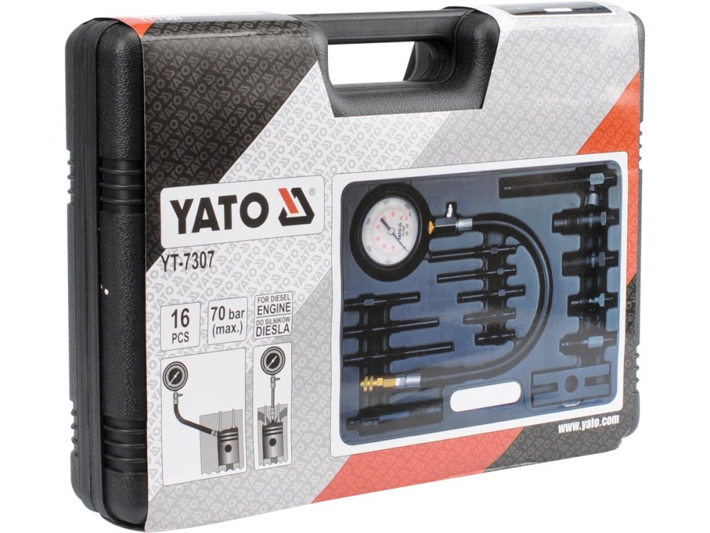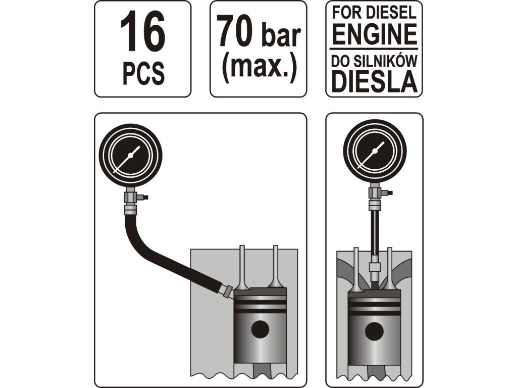 Na meranie kompresie Dieselových motorov max 70 bar. Súprava obsahuje adaptéry pre pripojenie merača k väčšine motorov bežných značiek automobilov. • Dĺžka 91 mm závit M10 x 1 mm