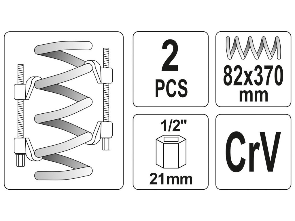 Dĺžka sťahováka 370 mm, šírka 82 mm a 1/2" / 21 mm zakončenie zaistí jednoduchú demontáž bežných vinutých pružín automobilov.
